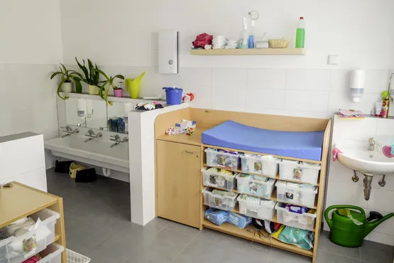 Im Inneren der Modulgebäude profitieren Kinder und Betreuer ebenfalls von höchsten Qualitätsstandards. So wurden in den Gruppenräumen bodentiefe Fenster eingesetzt, durch die viel Licht ins Innere gelangt. Sonnenschutz bieten außenliegende elektrische Jalousien und Markisen beziehungsweise Terrassenüberdachungen. Ein schwimmender Zementestrich sorgt für ein angenehmes Raumempfinden. Als Bodenbelag verwendete Zeppelin Rental Linoleum, in den Sanitärräumen Fliesen.